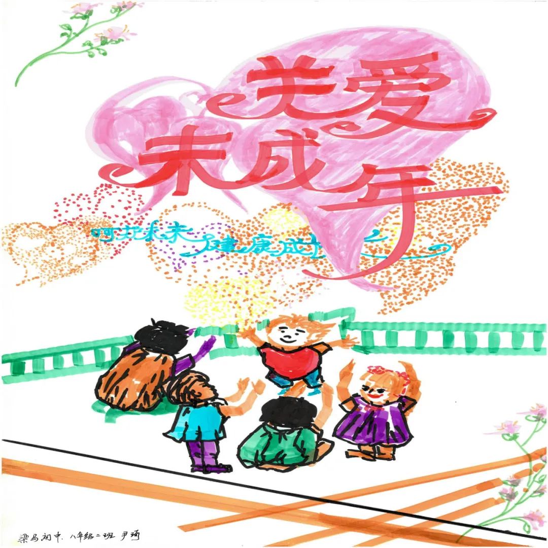 本作品的创作理念以“关爱未成年人”为主题,多个心形图案象征社会、家庭和学校多方协同唤醒人们对未成年人关注和保护意识,绿色栅栏、线条表示了对未成年有形(设施)和无形(制度)的安全保障,花朵象征着孩子们在全面保护下健康快乐成长。