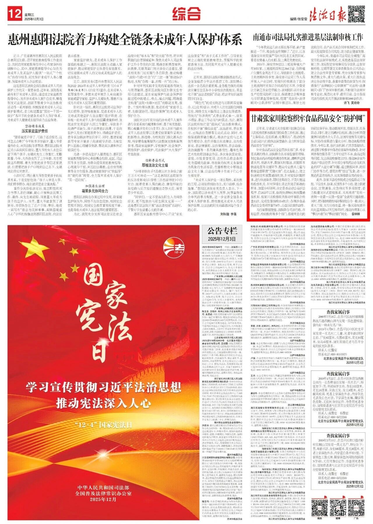 2025年12月3日,法治日报刊发《甘肃张家川检察织牢食品药品安全“防护网”》。