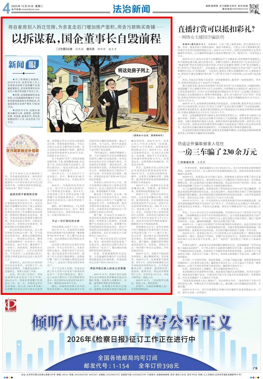 2025年12月30日,检察日报刊发《以拆谋私,国企董事长自毁前程》。