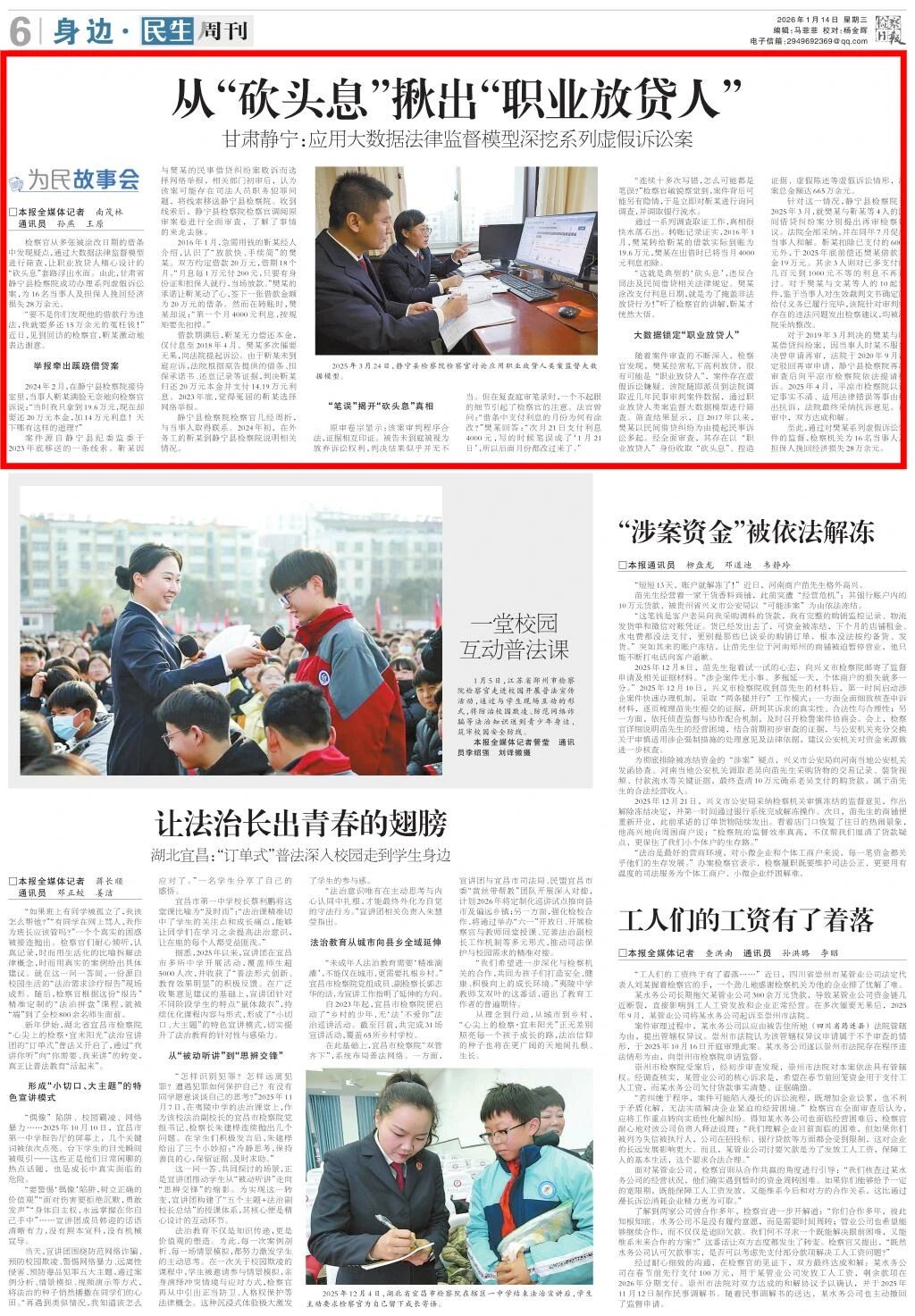 2026年1月14日,检察日报民生周刊刊发《从“砍头息”揪出“职业放贷人” 甘肃静宁:应用大数据法律监督模型深挖系列虚假诉讼案》。