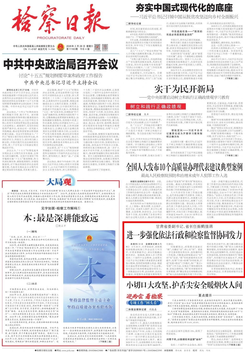 2026年2月28日,检察日报头版刊发《甘肃省委副书记、省长任振鹤强调 进一步强化依法行政和检察监督协同发力》。
