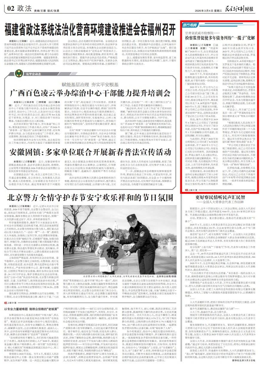 2026年3月4日,民主与法制时报刊发《甘肃省武威市检察院:检察监督促使多年债务纠纷“一揽子”化解》。