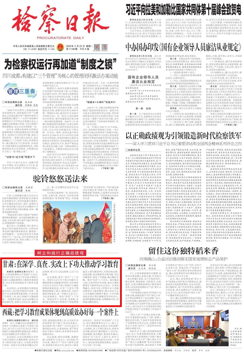 2026年3月23日,检察日报头版刊发《甘肃:在深学、真查、实改上下功夫推动学习教育》。